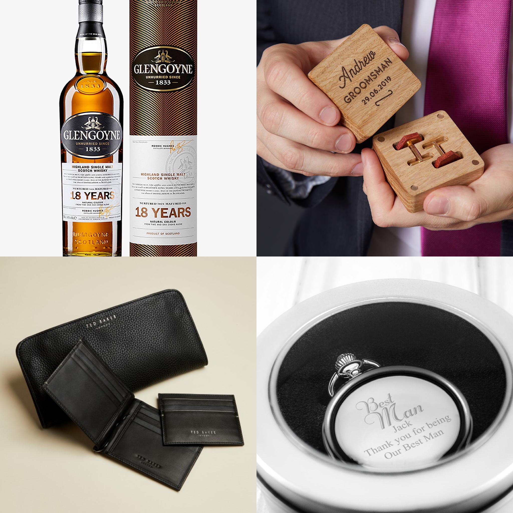 He may also be in charge of keeping the rings safe and calming the groom’s nerves the morning of the wedding. To say thank you for your Best Man’s help, you may consider gifting him something he can keep forever, like a personalised engraved pocket watch or cufflinks. If your budget is slightly higher, consider a leather wallet, like this one from Ted Baker, or perhaps a bottle of high end whiskey.