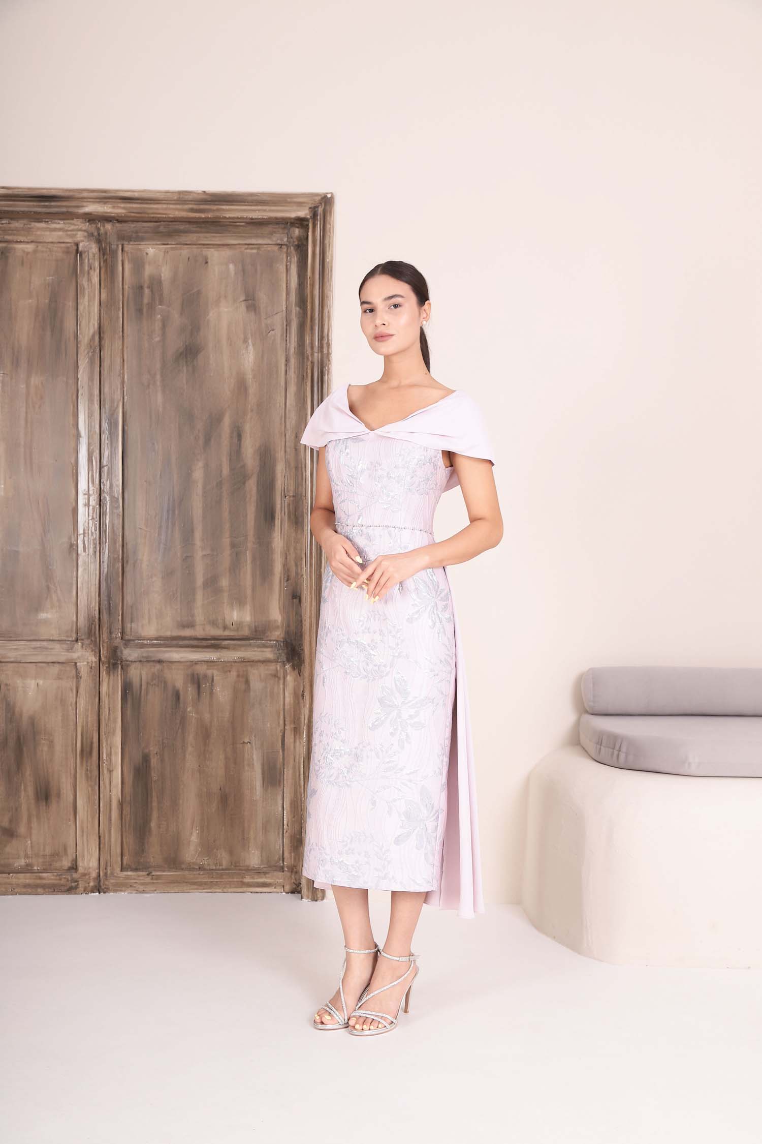 This is a midi dress with a fitted silhouette. It features an off-the-shoulder neckline with a wide, draped collar that elegantly wraps around the shoulders. The fabric has a subtle floral jacquard pattern with a slight sheen, adding texture and sophistication. The dress cinches at the waist with a thin, delicate belt, and the skirt falls straight with a modest slit or layered detail that gives it a slight flare at the back. Overall, it’s a graceful and refined design, perfect for formal occasions or evening events.