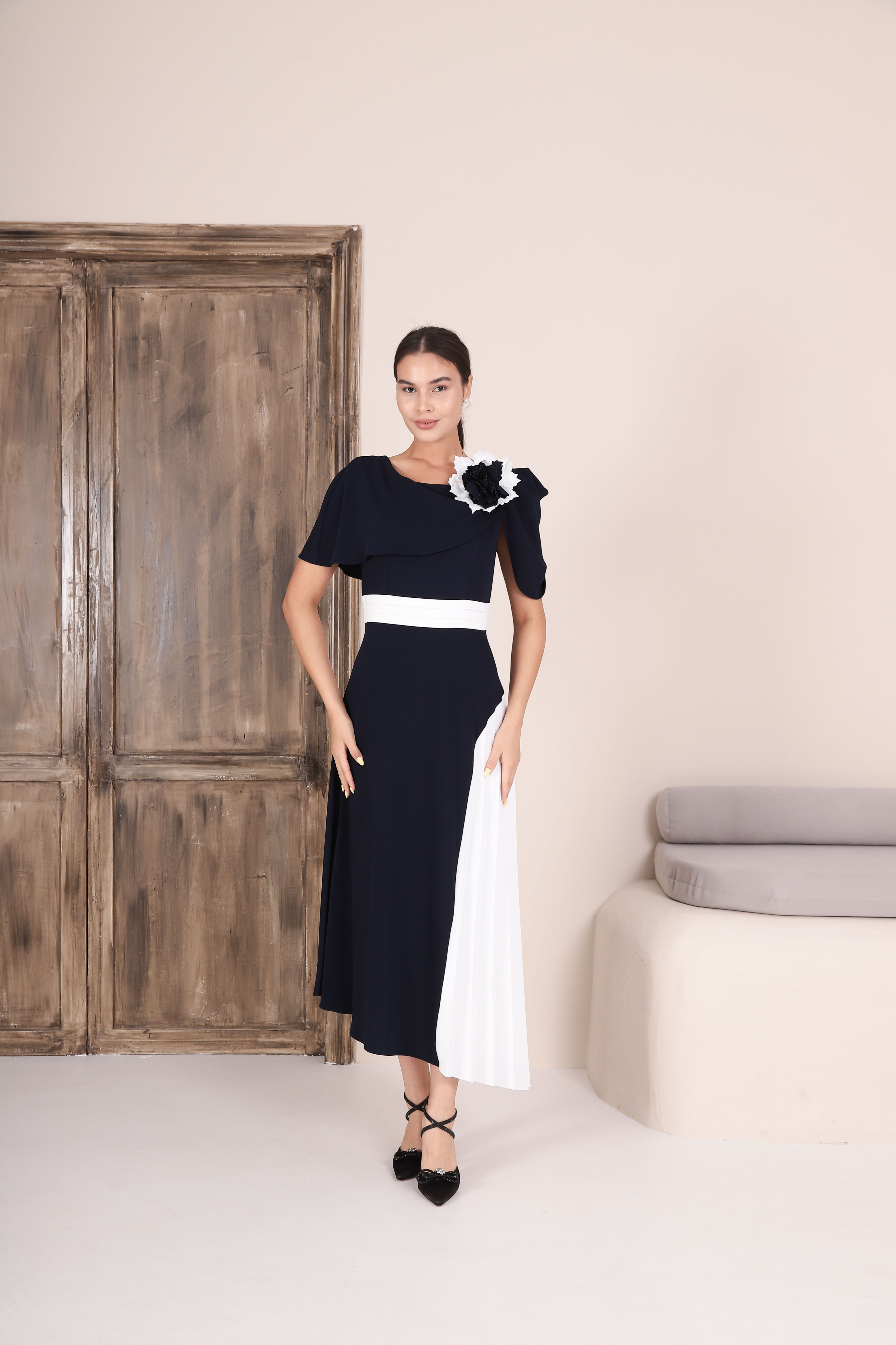 A chic black and white midi dress featuring an asymmetric draped bodice with a statement floral shoulder detail. The defined white waistband flatters the silhouette, while the colour-block skirt with pleated white panel adds elegant movement. A modern, sophisticated choice for weddings and formal occasions.