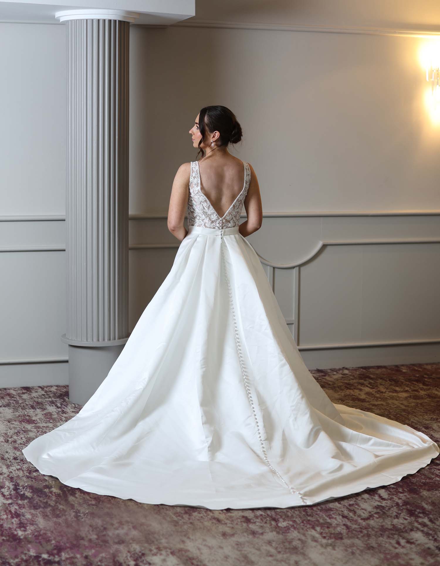 This is an elegant bridal gown with a lace V-neck bodice featuring a delicate floral pattern, paired with a full A-line skirt made from smooth, structured fabric. The skirt flows into a subtle train, giving the dress a classic, timeless look.